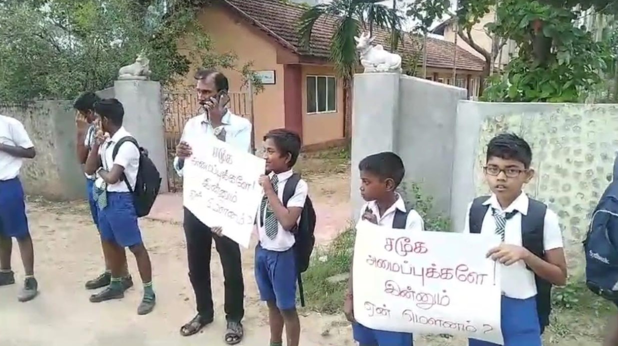 இன்று வியாழக்கிழமை மதியம் 1.30 மணியளவில் குறித்த போராட்டம் பாடசாலை முன்பாக இடம்பெற்றது.