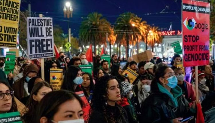 அமெரிக்காவில் கூகுள் அலுவலகத்திற்கு முன்னால் நூற்றுக்கணக்கான பணியாளர்கள் போராட்டத்தில் ஈடுபட்டுள்ளனர். ‘இனப் படுகொலைக்கு துணை நிற்காதே’ ‘இனப்படுகொலையால் லாபம் ஈட்டாதே’ என்பது போன்ற குறியீட்டுப் பலகைகளை ஏந்தி கோஷமெலுப்பி தங்கள் எதிர்ப்பைத் தெரிவித்து வருகின்றனர்.
