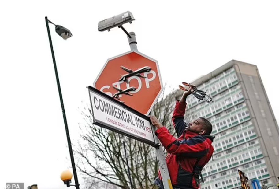 தெற்கு லண்டன் வீதியில் வைக்கப்பட்ட 50,000 பவுண்ட் மதிப்புள்ள STOP கலைப்படைப்பு! பட்டப்பகலில் திருடிய நபர் கைது