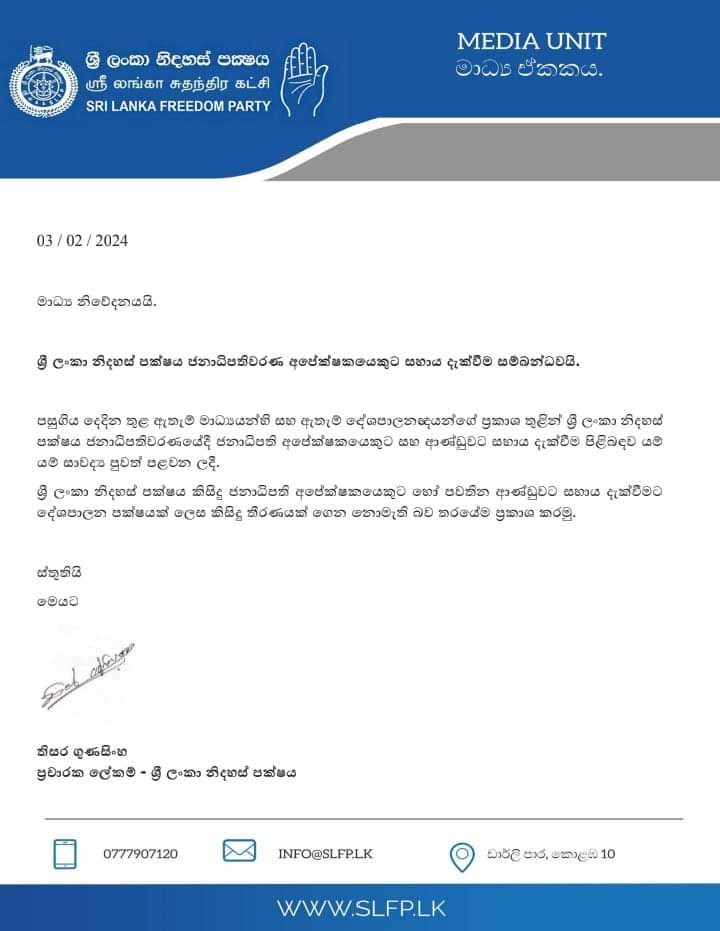 எந்தவொரு அதிபர் வேட்பாளருக்கோ அல்லது தற்போதுள்ள அரசாங்கத்திற்கோ ஆதரவளிப்பது குறித்து அரசியல் கட்சி என்ற ரீதியில் சிறி லங்கா சுதந்திரக் கட்சி இதுவரை எந்தவொரு தீர்மானத்தையும் எடுக்கவில்லை என அக்கட்சி அறிவித்துள்ளது.