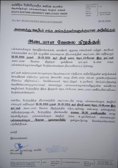 நாடளாவிய ரீதியில் பல்கலைக்கழக தொழிற்சங்கங்களின் சம்மேளனம் முன்னெடுக்கின்ற தொடர்ச்சியான இரு நாள் அடையாள வேலை நிறுத்தம் 28, 29.02.2024ம் திகதிகளில் தென் கிழக்கு பல்கலைக்கழகத்திலும் நடைபெறுகின்றது.