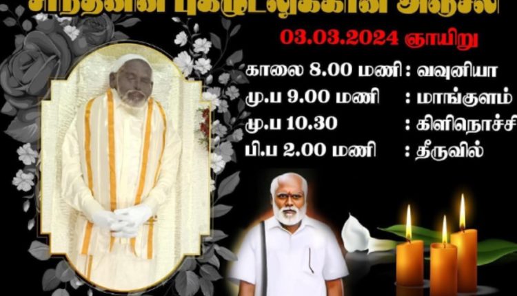மாலை அவரது வீட்டிற்கு எடுத்துச்செல்லப்படும் புகழுடல் நாளை திங்கட்கிழமை அவரது குடும்ப மயானமான எள்ளங்குளம் மயானத்தில் அடக்கம் செய்யப்படவுள்ளது.