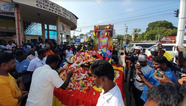 யாழ்ப்பாணத்தில் கொடிகாமம் நெல்லியடி ஊடாக அவரது பிறந்த மண்ணான உடுப்பிட்டிக்கு எடுத்துவரப்பட்டு வல்வெட்டித்துறை தீருவிலில் மக்கள் அஞ்சலிக்கு வைக்கப்படவுள்ளது.