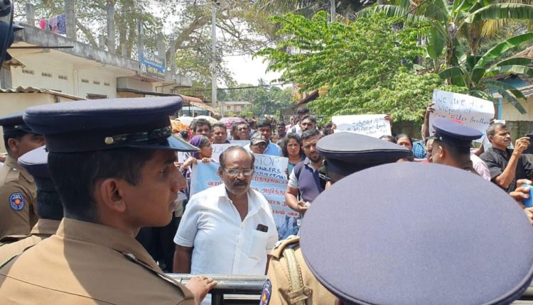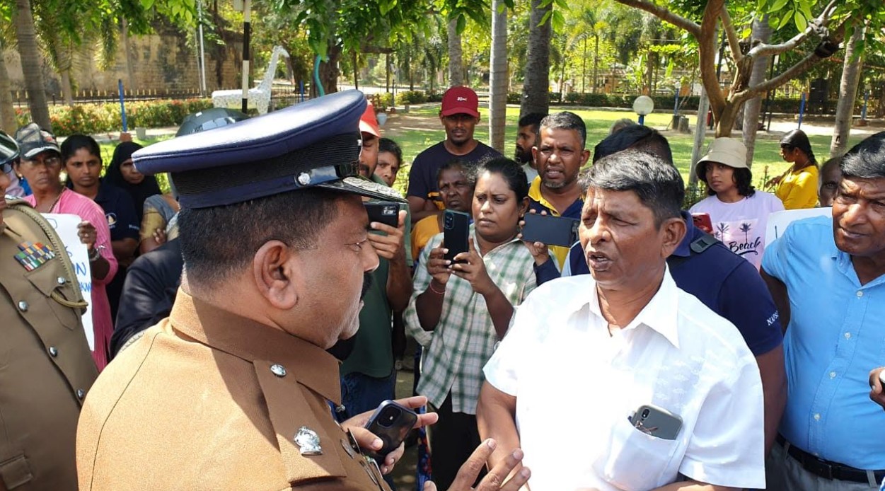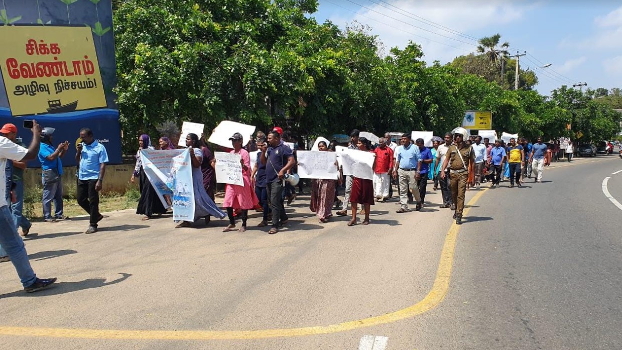 இந் நிலையில் பொலிஸாரால் இடைமறிக்கப்பட்ட போராட்டகார்ர்கள் இலங்கை மீனவர்களின் கடல் வளத்தை அழிக்காதே, தமிழக மீனவர்களின் அத்துமீறலை தடுத்து நிறுத்து, மீனவர்களின் வாழ்வாதாரத்தை அழிக்காதே உள்ளிட்ட பல்வேறு வாசகங்கள் எழுதப்பட்ட பதாகைகளைத் தாங்கியவாறு இலங்கை இந்திய அரசுகளுக்கு எதிராக கோசங்களை எழுப்பியவாறு போராட்டத்தில் ஈடுபட்டிருந்தனர்.