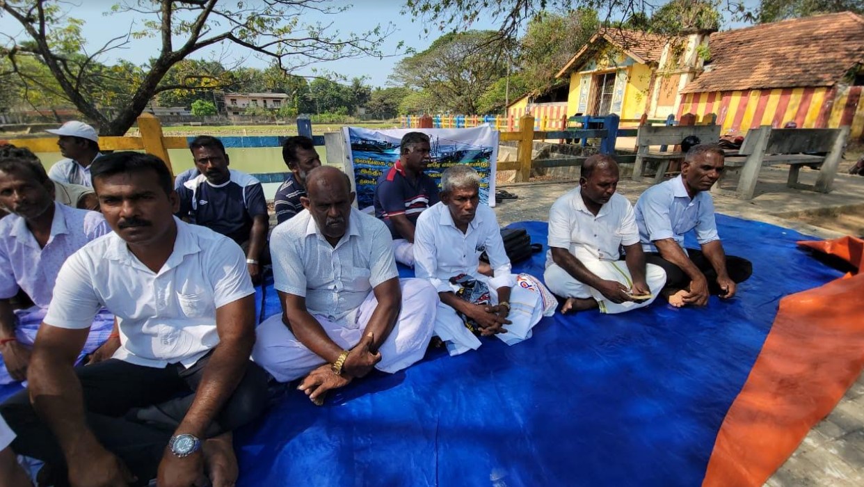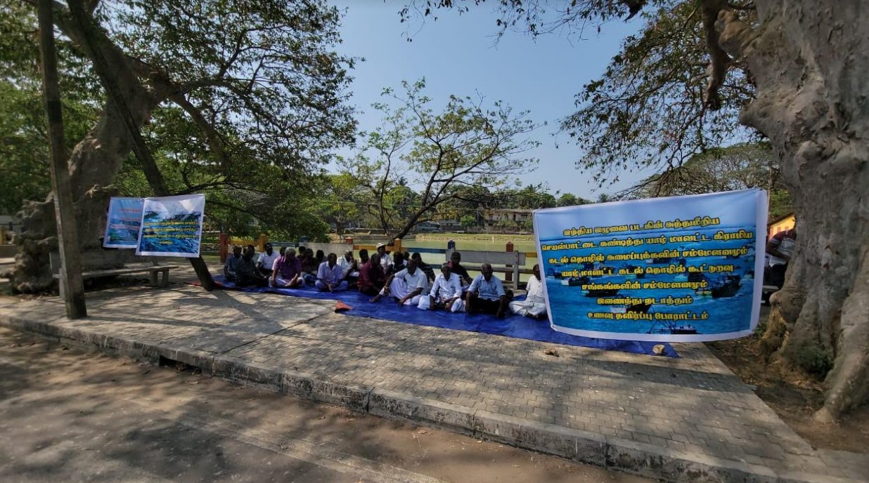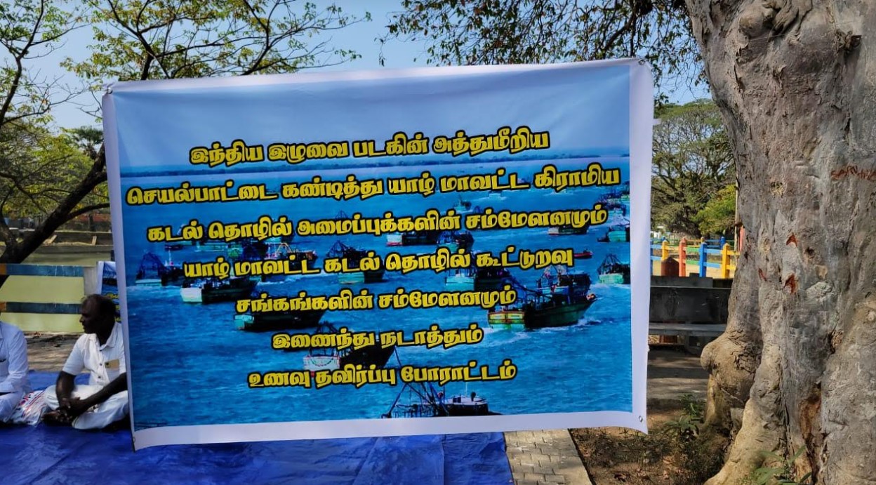 யாழ் மாவட்ட கிராமிய கடற்தொழில் அமைப்புக்களின் சம்மேளனமும், யாழ் மாவட்ட கடற் தொழில் கூட்டுறவு சங்கங்களின் சம்மேளனமும் இணைந்து யாழ்ப்பாணம் புனித ஜோன் பொஸ்கோ வித்தியாலயத்திற்கு முன்பாக உணவு தவிர்ப்பு போராட்டத்தில் ஈடுபட்டு வருகின்றனர்.