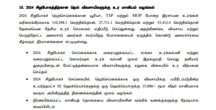 2024 ஆம் ஆண்டுக்கான சிறுபோக நெல் விவசாயிகளுக்கு உர மானியம் வழங்குவதற்கு அமைச்சரவை அங்கீகாரம் வழங்கியுள்ளது.