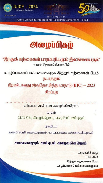 “இந்துக் கற்கைகள் பாரம்பரியமும் இலங்கையரும்” எனும் தொனிப்பொருளில் யாழ்ப்பாணப் பல்கலைக்கழக இந்துக் கற்கைகள் பீடம் நடாத்தும் இரண்டாவது சர்வதேச இந்து மாநாடு (IHC) – 2024 இன்று வியாழக்கிழமை (21) காலை 9 மணிக்கு யாழ் பல்கலைக்கழக கைலாசபதி கலையரங்கத்தில் நடைபெறவுள்ளது.