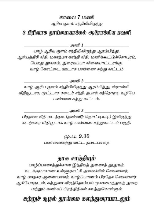 யாழ் ஆரியகுளம் சந்திப் பகுதியில் காலை 7 மணியளவில் ஆரம்பிக்கும் இந்தப் பணி, 3 வீதிகளூடாக யாழ் பண்ணைப் பகுதி வரையில் மேற்கொள்ளப்படத் திட்டமிடப்பட்டுள்ளது.