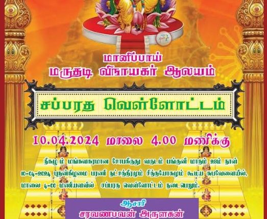 யாழ்ப்பாணம் – மானிப்பாய், மருதடி விநாயகர் ஆலய சப்பரத வெள்ளோட்டம் நாளைய தினம் புதன்கிழமை மாலை 04 மணிக்கு இடம்பெறவுள்ளது.
