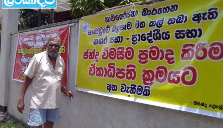 அரசாங்கத்தின் செல்வாக்கு காரணமாக பிற்போடப்பட்ட மாநகர சபை – உள்ளூராட்சி சபைத் தேர்தல்களை தாமதப்படுத்துவது தொல்லையாக உள்ளது என தேசப்பிரிய தனது வீட்டின் முன் பதாகையை தொங்கவிட்டுள்ளார்.
