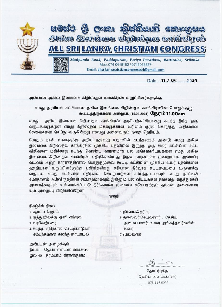 மட்டக்களப்பை மையப்படுத்தி ‘அகில இலங்கை கிறிஸ்தவ காங்கிரஸ்’ என்ற தலைப்புடன் ஒரு கடிதம் சமூக ஊடங்களில் வலம் வந்ததைத் தொடர்ந்து, இந்த அமைப்பின் பின்னணி என்ன என்ற தேடலை ஆரம்பித்தோம்.