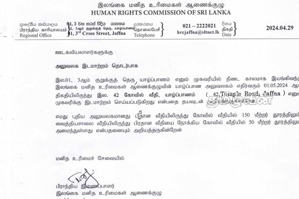 நீண்ட காலமாக இல.01, 03ஆம் குறுக்குத்தெரு யாழ்ப்பாணம் எனும் முகவரியில் இயங்கி வந்த இலங்கை மனித உரிமைகள் ஆணைக்குழுவின் யாழ்ப்பாண அலுவலகம் புதிய இடத்திற்கு இடமாற்றம் செய்யப்படவுள்ளதாக அறிவிக்கப்பட்டுள்ளது.
