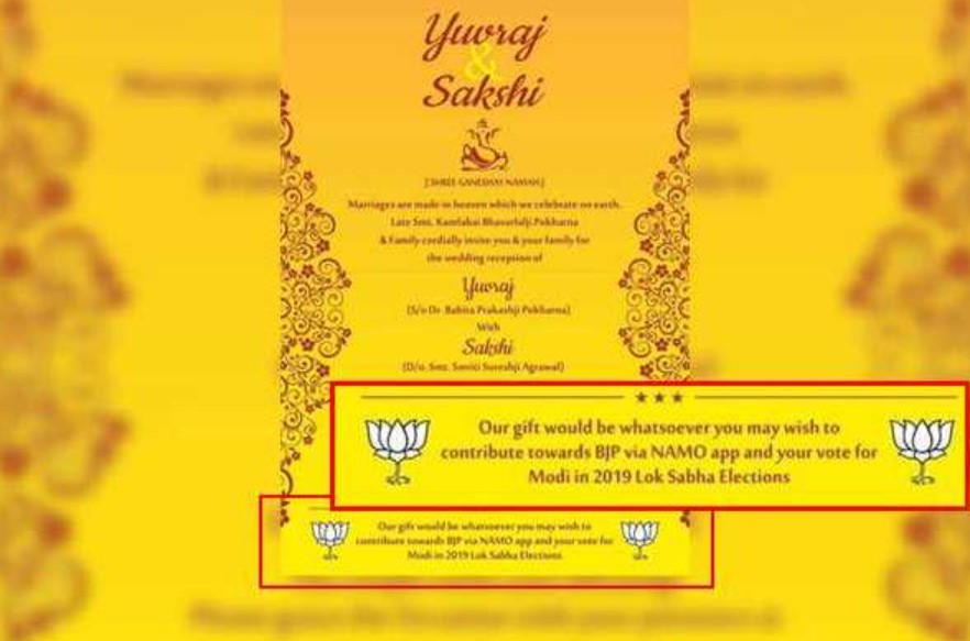 திருமணத்திற்காக அச்சடித்த வரவேற்பிதழில் மணமகன் ஒரு வரியை சேர்த்திருந்தார். அதாவது, பிரதமர் மோடியை மீண்டும் தேர்ந்தெடுப்பதே தம்பதிக்கு நீங்கள் அளிக்கும் சிறந்த பரிசாக இருக்கும் என இடம் பெற்றிருந்தது. இதை தொடர்ந்து, தேர்தல் ஆணையத்திடம் மணமகனுக்கு எதிராக உறவினரே புகார் அளித்துள்ளனர்.