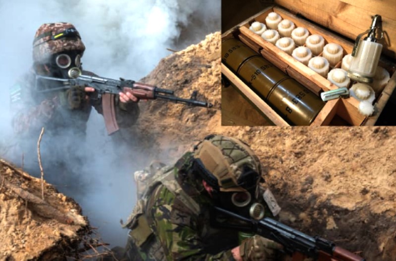 குளோரோபிரின் உடன் சிஎஸ் மற்றும் சிஎன் வாயுக்கள் (CS and CN gasses) நிரப்பப்பட்ட கையெறி குண்டுகளை ரஷ்யா பயன்படுத்தியதாக உக்ரைன் ராணுவம் குற்றம் சாட்டியுள்ளது.