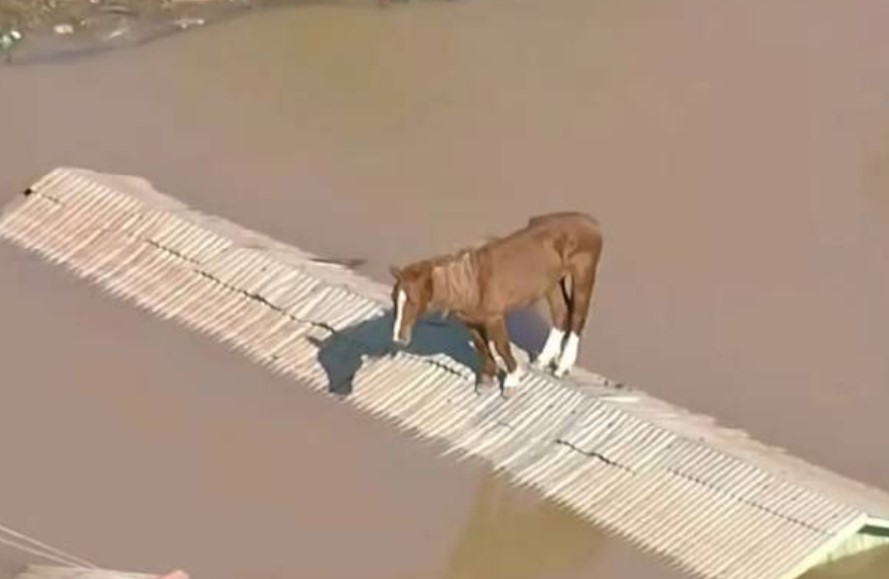 பிரேசில் வெள்ளத்தில் உயிர் தப்பிக்க பல மணிநேரமாக கட்டிட மேற்கூரை மேல் நின்ற குதிரை!
