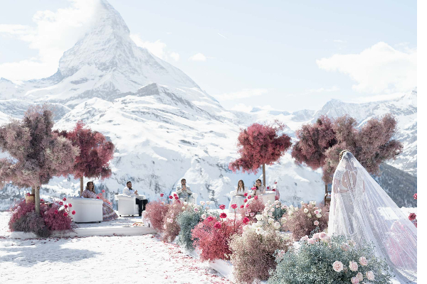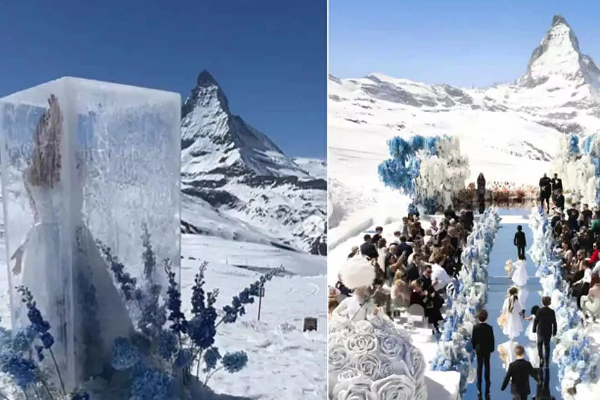 சுவிட்சர்லாந்தின் பனி படர்ந்த ஆல்பைன் சிகரங்களில் திருமணம் நடந்தது. சுமார் 2222 மீட்டர் உயரத்தில் அமைந்துள்ள பனி சிகரத்தில் நடைபெற்ற இந்த திருமணத்தில் மணமக்கள் பனியில் இருந்து வெளியே வந்தனர்.