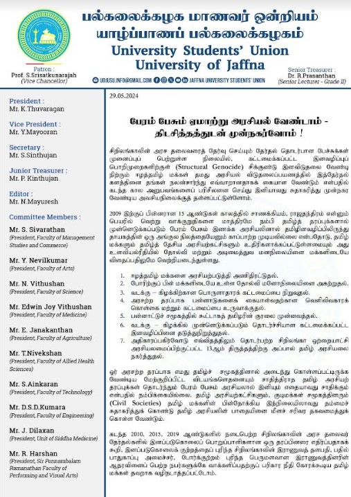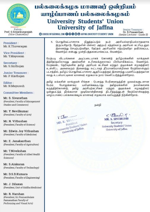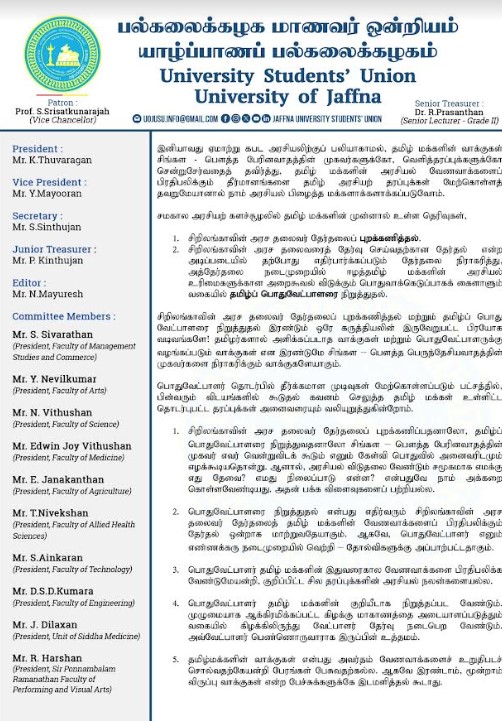 ஜனாதிபதி தேர்தலில் தமிழ் மக்களின் நிலைப்பாடு தொடர்பில் யாழ்ப்பாணப் பல்கலைக்கழக மாணவர் ஒன்றியம் வெளியிட்ட அறிக்கையில் இவ்விடயம் தெரிவிக்கப்பட்டுள்ளது.