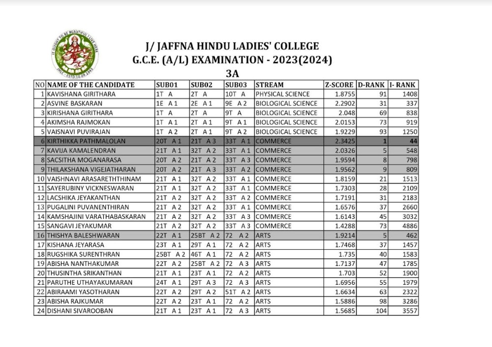 நேற்று வெளியாகிய க.பொ.த உயர்தரப் பரீட்சையில் வணிகவியலில் யாழ். இந்து மகளிர் கல்லூரி மாணவி கிர்த்திகா பத்மலோஜன் யாழ். மாவட்டத்தில் முதல் நிலையைப் பெற்றிருக்கிறார்.