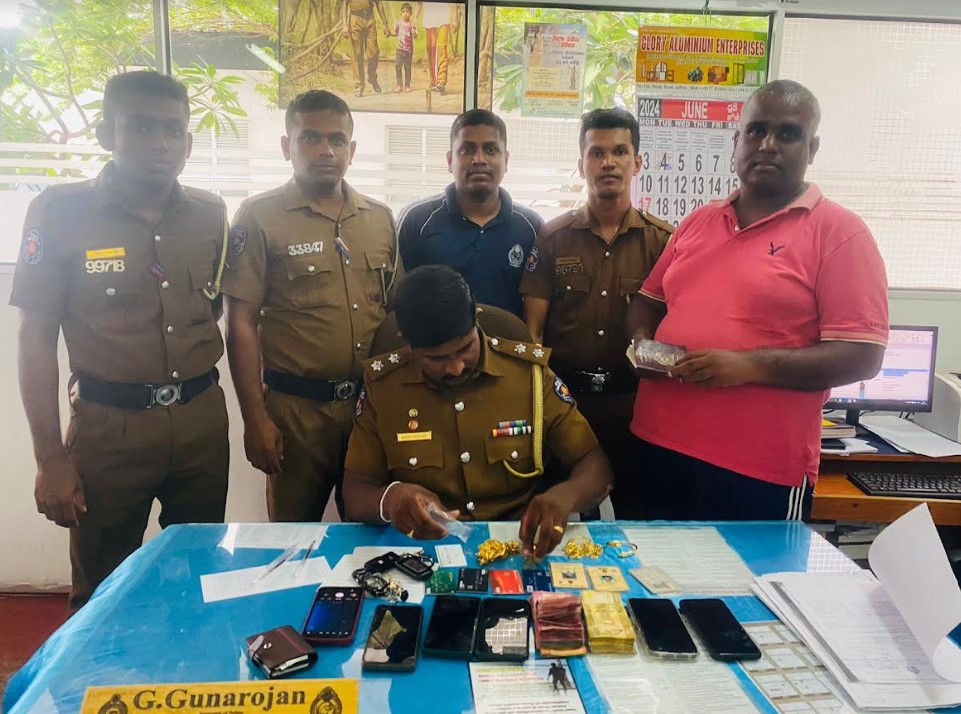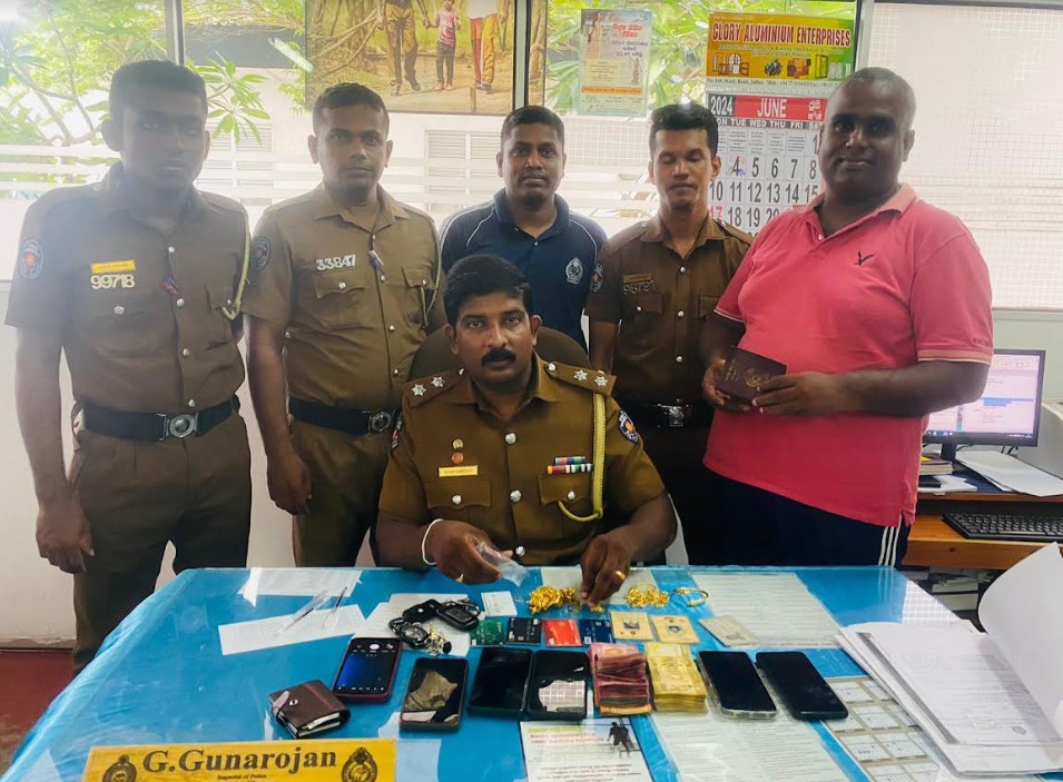 குறித்த நபர், சுமார் ஒரு கோடியே 50 இலட்ச ரூபாய் பெறுமதியான அதிசொகுசு காரில் யாழ்.நகர் பகுதியில் பயணித்த போதே பொலிஸாரினால் கைது செய்யப்பட்டதுடன் , கைது செய்யப்பட்ட வேளை ,காரினுள் இருந்து 15 பவுண் தங்க நகைகள் , 05 இலட்ச ரூபாய் பணம் மற்றும் இலட்ச ரூபாய்க்கள் பெறுமதியான அதிநவீன கையடக்க தொலைபேசிகள் 05 என்பவற்றை பொலிஸார் மீட்டுள்ளனர்.