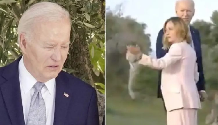 Biden appears confused as he SALUTES Italian Prime Minister Giorgia Meloni and then walks off at the G7 Summit.