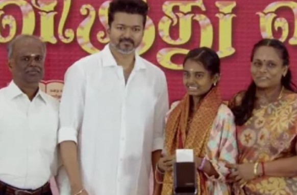 மிழக வெற்றி கழகத்தின் விருது வழங்கும் விழாவில் 9 மாணவர்களுக்கு வைர கம்மல் மற்றும் வைர மோதிரத்தை விஜய் வழங்கினார்.