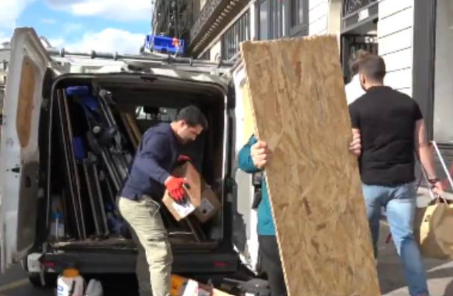 Champs-Elyseesயில் சாத்தியமான குழப்பத்தில் இருந்து கடைகளின் ஜன்னல்களை பாதுகாக்க தொழிலாளர்கள் மரத்தாலான Panels-ஐ பயன்படுத்துவதில் ஈடுபட்டுள்ளனர்.