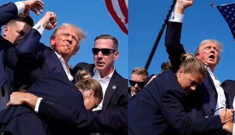 மேடைக்கு வந்த பாதுகாவலர்கள் அவரை சூழ்ந்துகொள்ள, முகத்தில் ரத்தம் வழிய டிரம்ப் தனது கையை உயர்த்தினார்.