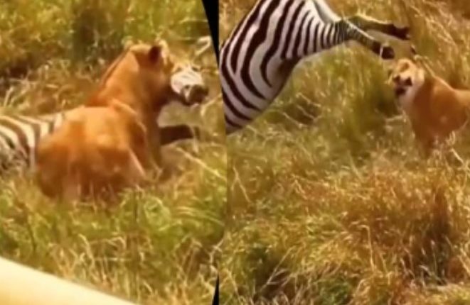 இங்கு வரிக்குதிரையின் குட்டி ஒன்றினை சிங்கம் வேட்டையாட முயற்சித்துள்ளது. இதனை எங்கிருந்தோ அவதானித்த தாய் வரிக்குதிரை மின்னல் வேகத்தில் வந்து சிங்கத்தினை துவம்சம் செய்துள்ளது.