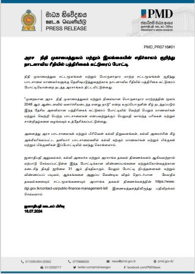 இதன்படி, போட்டி நிபந்தனைகள் மற்றும் விண்ணப்ப படிவம், ஆக்கங்களை அனுப்ப வேண்டிய விதம் தொடர்பான மேலதிக தகவல்களையும் சட்டமூலங்களையும் அரசாங்க தகவல் திணைக்களத்தின் https://www. dgi.gov.lk/contact-us/public-finance-management-bill இணையத்தளத்தில் இருந்து பதிவிறக்கம் செய்யலாம் என அறிவுறுத்தப்பட்டுள்ளது.