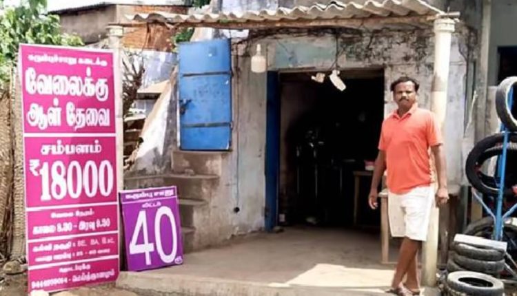 அந்த பேனரில் “கரும்புச்சாறு கடைக்கு வேலைக்கு ஆள் தேவை சம்பளம் ரூ.18 ஆயிரம், வேலை நேரம் காலை 8:30 மணி முதல் இரவு 9:30 மணி வரை என்று எழுதப்பட்டுள்ளது. கல்வி தகுதி பிஇ, பிஏ, பி.எஸ்சி என்றும், வயது வரம்பு 25 முதல் 40 வரை” என குறிப்பிடப்பட்டுள்ளது.