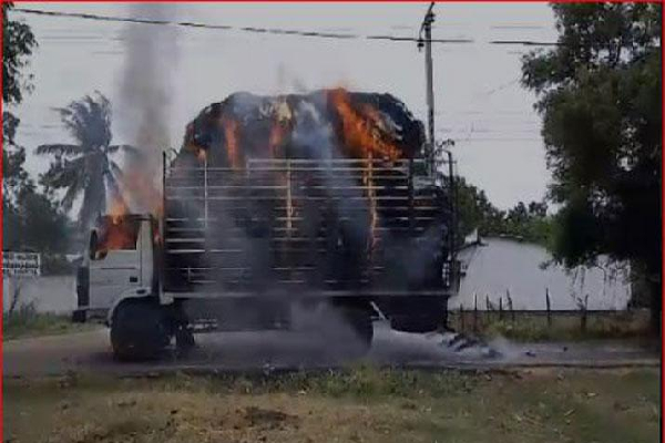 மின்சார கம்பியில் சிக்கி பற்றியெரிந்த பாரவூர்தி