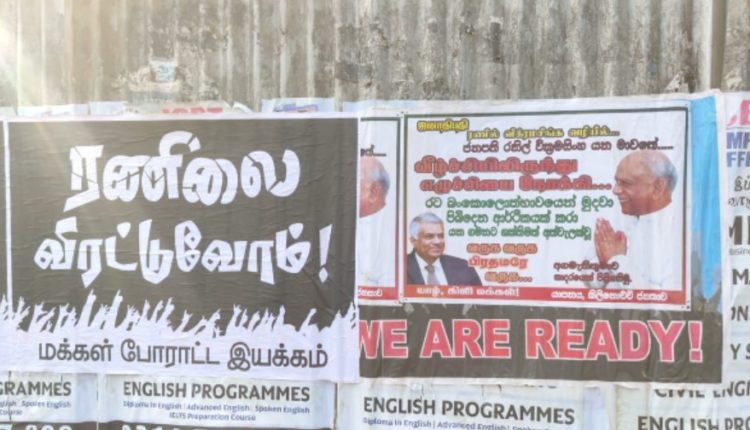 மக்கள் போராட்ட இயக்கத்தினால் தயாரிக்கப்பட்ட குறித்த சுவரொட்டியில் “ரணிலை விரட்டுவோம்“ என குறிப்பிடப்பட்டுள்ளது.