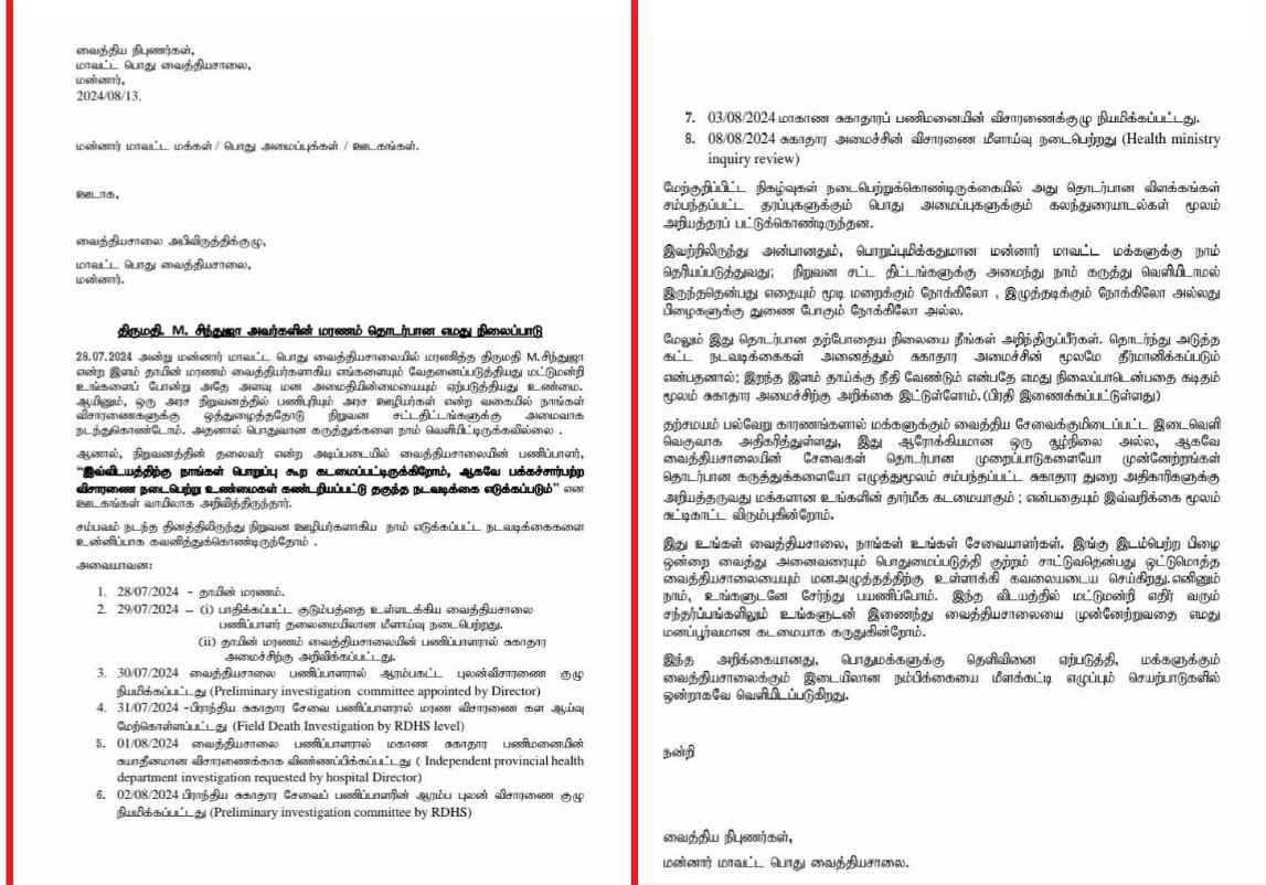 “மன்னார் மாவட்ட பொது வைத்தியசாலையில் மரணித்த ஆ.சிந்துஜா என்ற இளம் தாயின் மரணம் வைத்தியர்களாகிய எங்களையும் வேதனைப்படுத்தியது மட்டுமன்றி உங்களைப் போன்று அதே அளவு மன அமைதியின்மையையும் ஏற்படுத்தியது உண்மை.