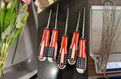 அந்த பெண்ணிடம் இருந்த பையில் செயற்கை பூக்கள் மற்றும் ஸ்குரு டிரைவர்கள் இருந்தது. அவற்றை சோதனை செய்தபோது தான் அதிர்ச்சி காத்திருந்தது.