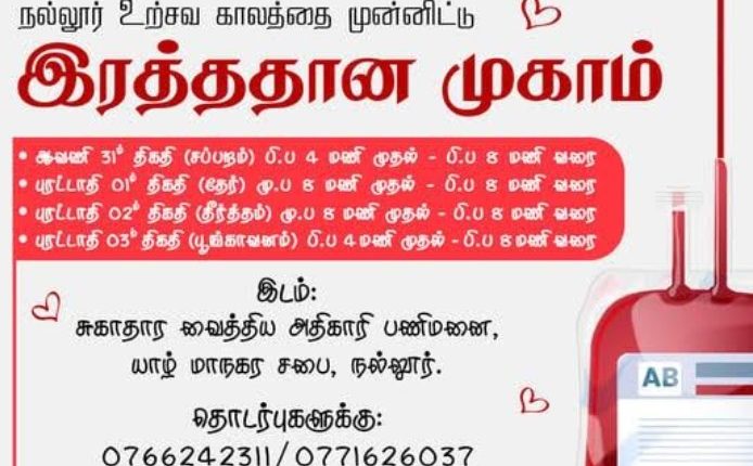 நல்லூர் ஆலயத்திற்கு அருகில் உள்ள யாழ் மாநகர சுகாதார வைத்திய அதிகாரி பணிமனையில் , எதிர்வரும் 31ஆம் திகதி சப்பர திருவிழா அன்று, மாலை 4 மணி முதல் இரவு 8 மணி வரையிலும், மறுநாள் தேர்த்திருவிழா அன்றும் 02ஆம் திகதி தீர்த்த திருவிழா அன்றும் காலை 08 மணி முதல் இரவு 08 மணி வரையிலும் , 03ஆம் திகதி பூங்காவன திருவிழா அன்று மாலை 04 மணி முதல் இரவு 08 மணி வரை இரத்த தானம் வழங்க முடியும் என அறிவிக்கப்பட்டுள்ளது.