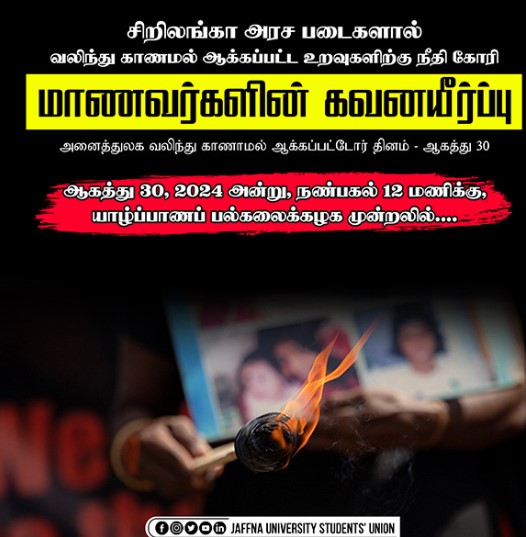 அனைத்துலக வலிந்து காணமல் ஆக்கப்பட்டவர்கள் நாளினை முன்னிட்டுயாழ்ப்பாணப் பல்கலைக்கழக முன்றலில் நண்பகல் 12 மணியளவில் நாளை (30.08.2024) குறித்த ஆர்ப்பாட்டம் நடத்தப்படவுள்ளதாக தெரிவிக்கப்படுகிறது.