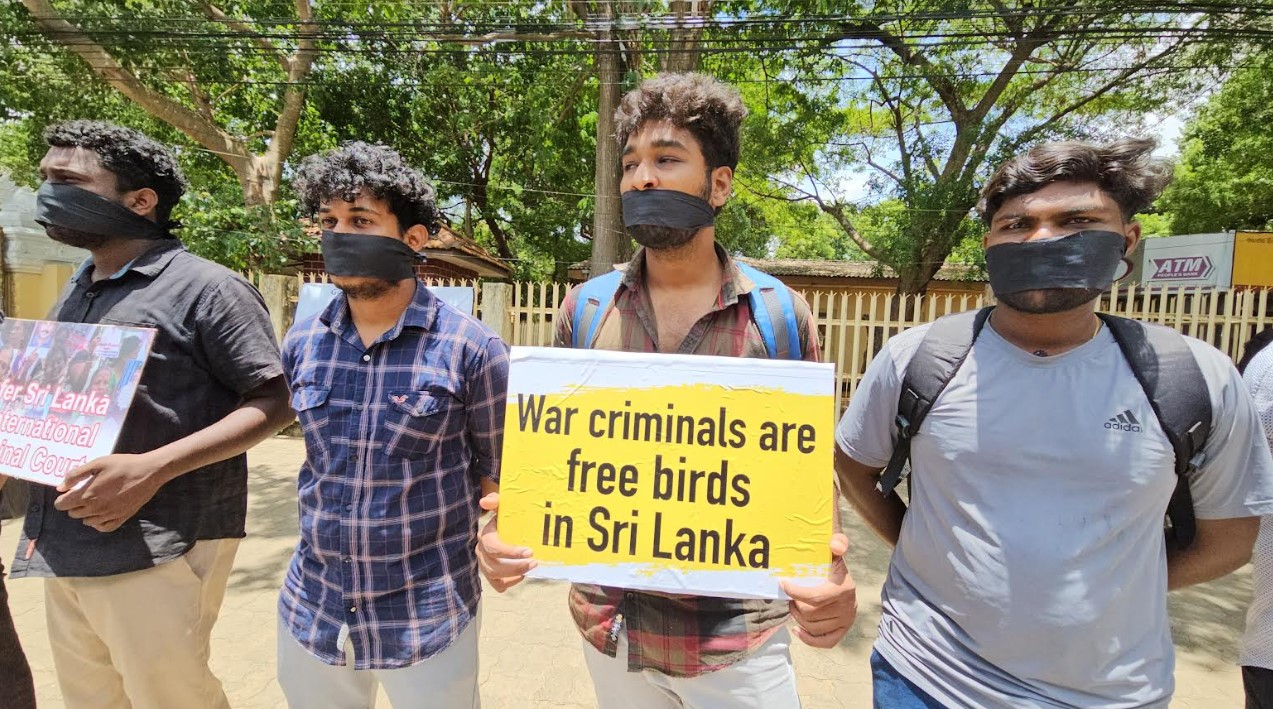 யாழ்ப்பாண பல்கலைக்கழக மாணவர் ஒன்றியத்தின் ஏற்பாட்டில் முன்னெடுக்கப்பட்ட போராட்டத்தில் ஈடுபட்டவர்கள் பதாதைகளை ஏந்தி, வாய்களை கறுப்பு துணியால் கட்டி போராட்டத்தில் ஈடுபட்டனர்.