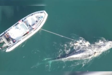 கிட்டத்தட்ட 50க்கும் மேற்பட்ட மீன் வலை கயிறுகள் வெட்டி எடுக்கப்பட்ட பிறகு சுமார் 11மீ(36 அடி) நீளம் கொண்ட ஹம்ப்பேக் திமிங்கலம் பாதுகாப்பாக விடுவிக்கப்பட்டது.