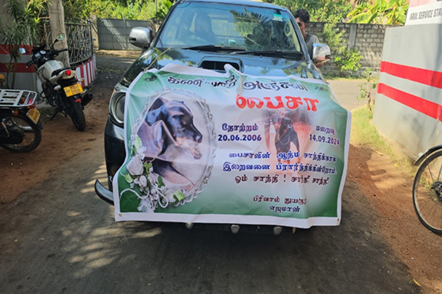 உயிரிழந்த நாயின் உரிமையாளர், கடந்த பத்து வருடங்களாக தனக்கு பாதுகாப்பினை வழங்கிய நன்றிக் கடனுக்காக மனிதர்களுக்கு செய்கின்ற இறுதிச் சடங்கு போல குறித்த நாயிற்கும் இறுதிச் சடங்கினை நடத்தியுள்ளார்.