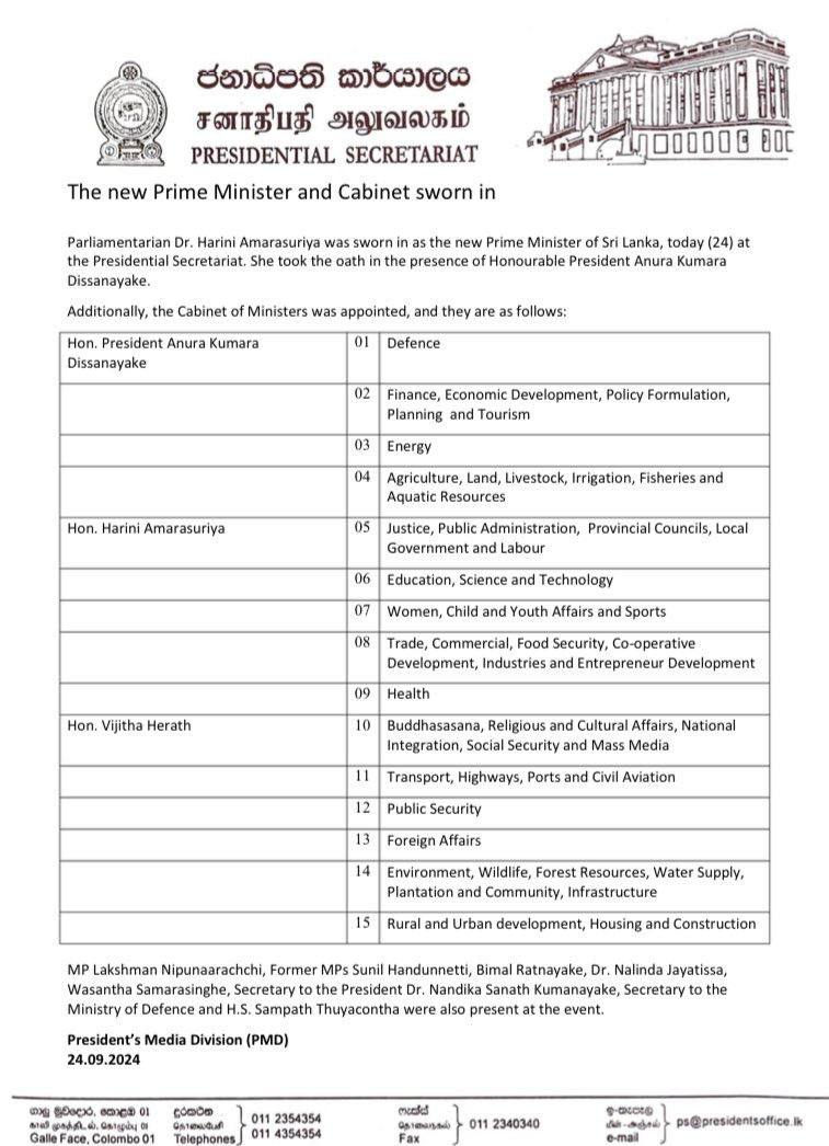 மேலும், கலாநிதி ஹரினி அமரசூரிய நீதி, பொது நிர்வாகம், உள்நாட்டலுவல்கள், மாகாண சபைகள், உள்ளூராட்சி மற்றும் தொழில் கல்வி, விஞ்ஞான மற்றும் தொழில்நுட்பம், பெண்கள், சிறுவர்கள் மற்றும் இளைஞர் விவகாரம் மற்றும் விளையாட்டு, வர்த்தகம், வாணிபம், உணவுப் பாதுகாப்பு, கூட்டுறவு அபிவிருத்தி, கைத்தொழில் மற்றும் தொழில் முனைவோர் அபிவிருத்தி, சுகாதாரம் போன்ற அமைச்சுக்கள் ஒதுக்கப்பட்டுள்ளன.