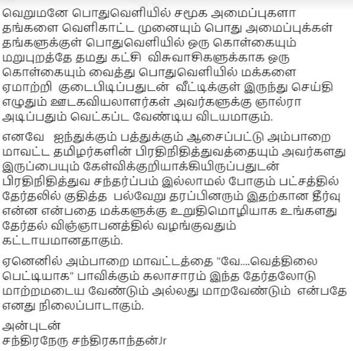எனவே ஐந்துக்கும் பத்துக்கும் ஆசைப்பட்டு அம்பாறை மாவட்ட தமிழர்களின் பிரதிநிதித்துவத்தையும் அவர்களது இருப்பையும் கேள்விக்குறியாக்கியிருப்பதுடன் பிரதிநிதித்துவ சந்தர்ப்பம் இல்லாமல் போகும் பட்சத்தில் தேர்தலில் குதித்த பல்வேறு தரப்பினரும் இதற்கான தீர்வு என்ன என்பதை மக்களுக்கு உறுதிமொழியாக உங்களது தேர்தல் விஞ்ஞாபனத்தில் வழங்குவதும் கட்டாயமானதாகும்.