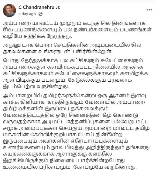 அம்பாறை மாவட்ட தமிழ் பிரதிநிதித்துவத்தை பெற்றுக்கொள்வது தொடர்பில் இன்று தனது முகப்புத்தகம் வாயிலாக இவ்வாறு கேட்டுக்கொண்டுள்ளார்.