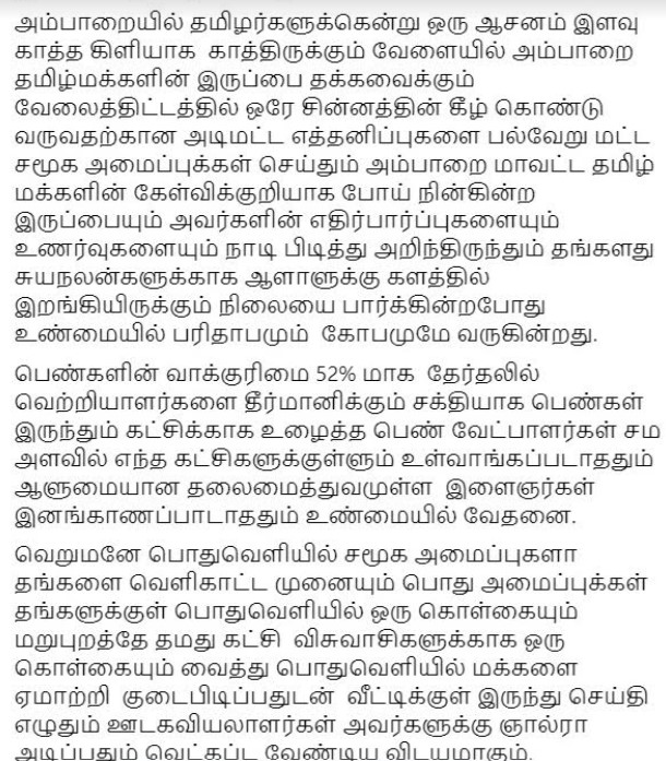 அம்பாறையில் தமிழர்களுக்கென்று ஒரு ஆசனம் இளவு காத்த கிளியாக காத்திருக்கும் வேளையில் அம்பாறை தமிழ்மக்களின் இருப்பை தக்கவைக்கும் வேலைத்திட்டத்தில் ஒரே சின்னத்தின் கீழ் கொண்டு வருவதற்கான அடிமட்ட எத்தனிப்புகளை பல்வேறு மட்ட சமூக அமைப்புக்கள் செய்தும் அம்பாறை மாவட்ட தமிழ் மக்களின் கேள்விக்குறியாக போய் நின்கின்ற இருப்பையும் அவர்களின் எதிர்பார்ப்புகளையும் உணர்வுகளையும் நாடி பிடித்து அறிந்திருந்தும் தங்களது சுயநலன்களுக்காக ஆளாளுக்கு களத்தில் இறங்கியிருக்கும் நிலையை பார்க்கின்றபோது உண்மையில் பரிதாபமும் கோபமுமே வருகின்றது.