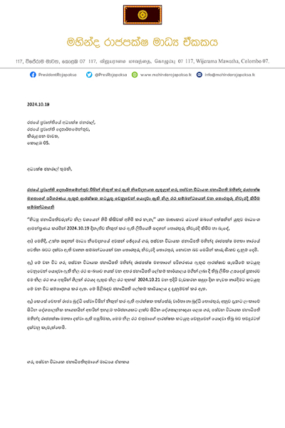 முன்னாள் ஜனாதிபதி மஹிந்த ராஜபக்ஷவின் ஊடகப் பிரிவு விடுத்துள்ள அறிக்கையை கீழே காணலாம்.