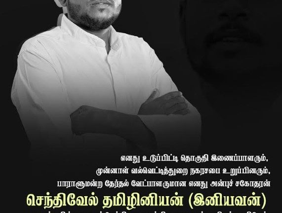 எனது உடுப்பிட்டி தொகுதி இணைப்பாளரும், முன்னாள் வல்வெட்டித்துறை நகரசபை உறுப்பினரும், பாராளுமன்ற தேர்தல் வேட்பாளருமான எனது அன்புச் சகோதரன் செந்திவேல் தமிழினியன் (இனியவன்) அவர்களின் மறைவுச் செய்தியை கலங்கிய மனதுடன் அறியத்தருகிறேன்.