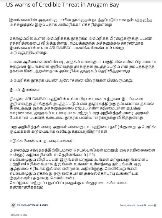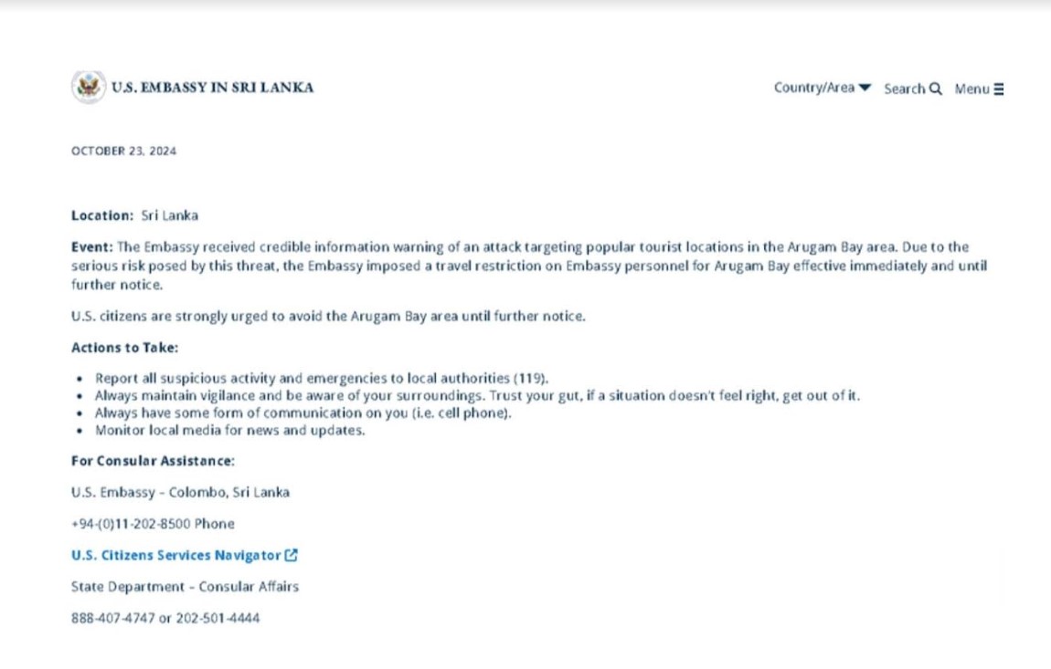 இஸ்ரேலிய சுற்றுலாப் பயணிகளின் அதிகரிப்பு மற்றும் அறுகம் விரிகுடா பகுதிக்கு வருகை தரும் தனது பிரஜைகளுக்கு அறிவுறுத்தல் பயண ஆலோசனையை கொழும்பில் உள்ள அமெரிக்க தூதரகம் வழங்கியுள்ளதாக இலங்கை பொலிஸ் இன்று தெரிவித்துள்ளது.