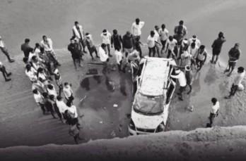 ஆனால், குறித்த பாலம் வெள்ளத்தினால் பாதி இடிந்து இருந்தது. அதனை அறியாமல் சாரதி காரினை ஓட்டியதால், சுமார் 50 அடி உயரத்தில் இருந்து கீழே விழுந்து நொறுங்கியது.
