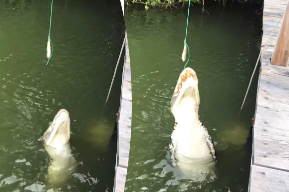 இங்கு சில நபர்கள் அவ்வாறான முதலையிடம் தனது வேலையை காட்டியுள்ளனர். அதாவது கயிறு ஒன்றில் மீனை கட்டி தொங்கவிட்டு அதனை சாப்பிடுவதற்கு முதலையிடம் கொடுத்துள்ளனர்.