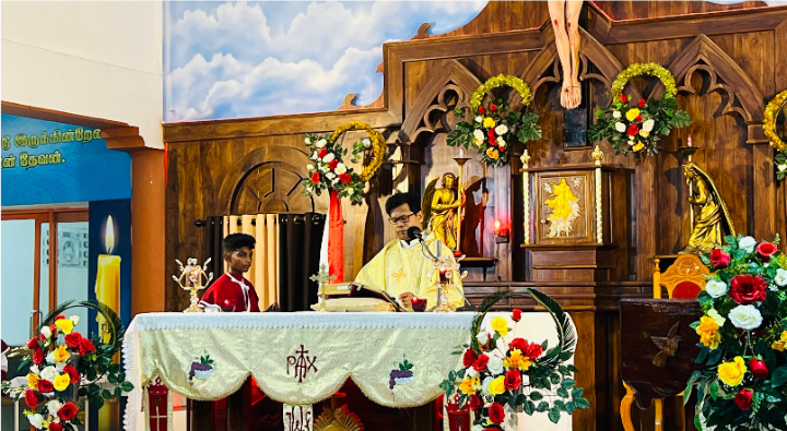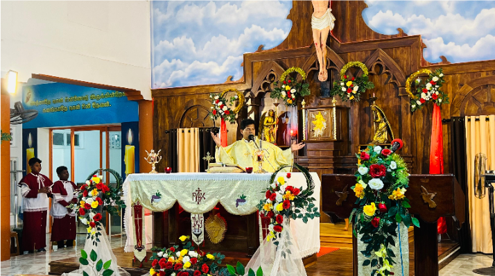 பங்குத்தந்தை பேதுறு ஜீவராஜ் தலைமையில் கூட்டுத்திருப்பலியாக ஒப்புக்கொடுக்கப்பட்டது.அத்துடன் தேவாலயத்தை சுற்றி இராணுவம் பொலிசார் பாதுகாப்பு நடவடிக்கையில் ஈடுபட்டிருந்தமை குறிப்பிடத்தக்கது.