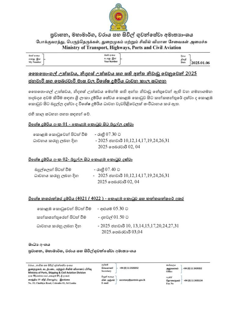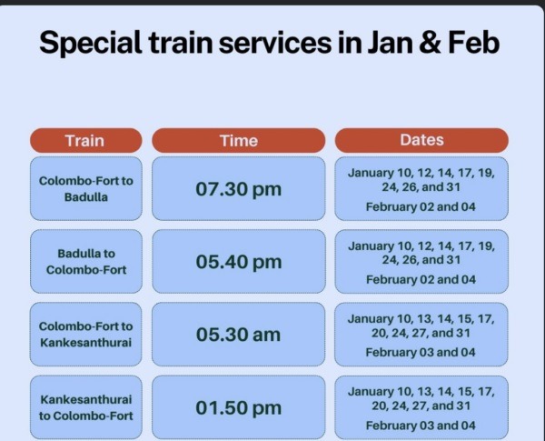 தைப் பொங்கல் பண்டிகை, சுதந்திர தினம் மற்றும் வார இறுதி விடுமுறை நாட்களுக்காக, போக்குவரத்து, நெடுஞ்சாலைகள், துறைமுகங்கள் மற்றும் சிவில் விமானப் போக்குவரத்து அமைச்சகம் 2024 ஜனவரி மற்றும் பிப்ரவரி மாதங்களுக்கான சிறப்பு ரயில் கால அட்டவணையை வெளியிட்டுள்ளது.